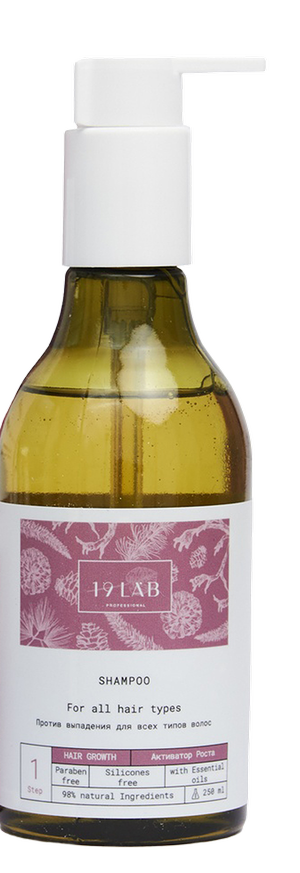 Уникальный шампунь от 19Lab, насыщенный комплексом натуральных масел и экстрактов для решения проблем с избыточным выпадением волос и стимуляции роста волос. Этот шампунь на мягкой моющей основе из 100% кокосового масла не содержит парабенов, красителей, эффективно, но мягко очищает и смягчает волосы, улучшает кровообращение кожи головы, благодаря эфирным маслам розмарина, кедра и пихты, которые подобраны в оптимально сбалансированном составе для укрепления и роста Ваших волос.
