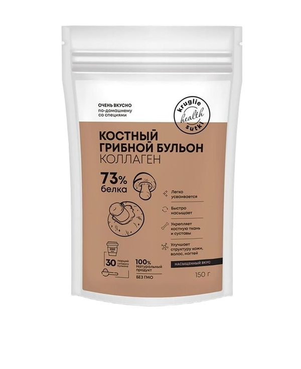 Состав грибного бульона: гидролизованный коллаген говяжий, бульон костный пищевой сухой говяжий, пептиды коллагена говяжьего, грибы сушеные, соль, луковый порошок, оливковое масло, пребиотик(инулин), петрушка сухая, укроп сухой, лавр.