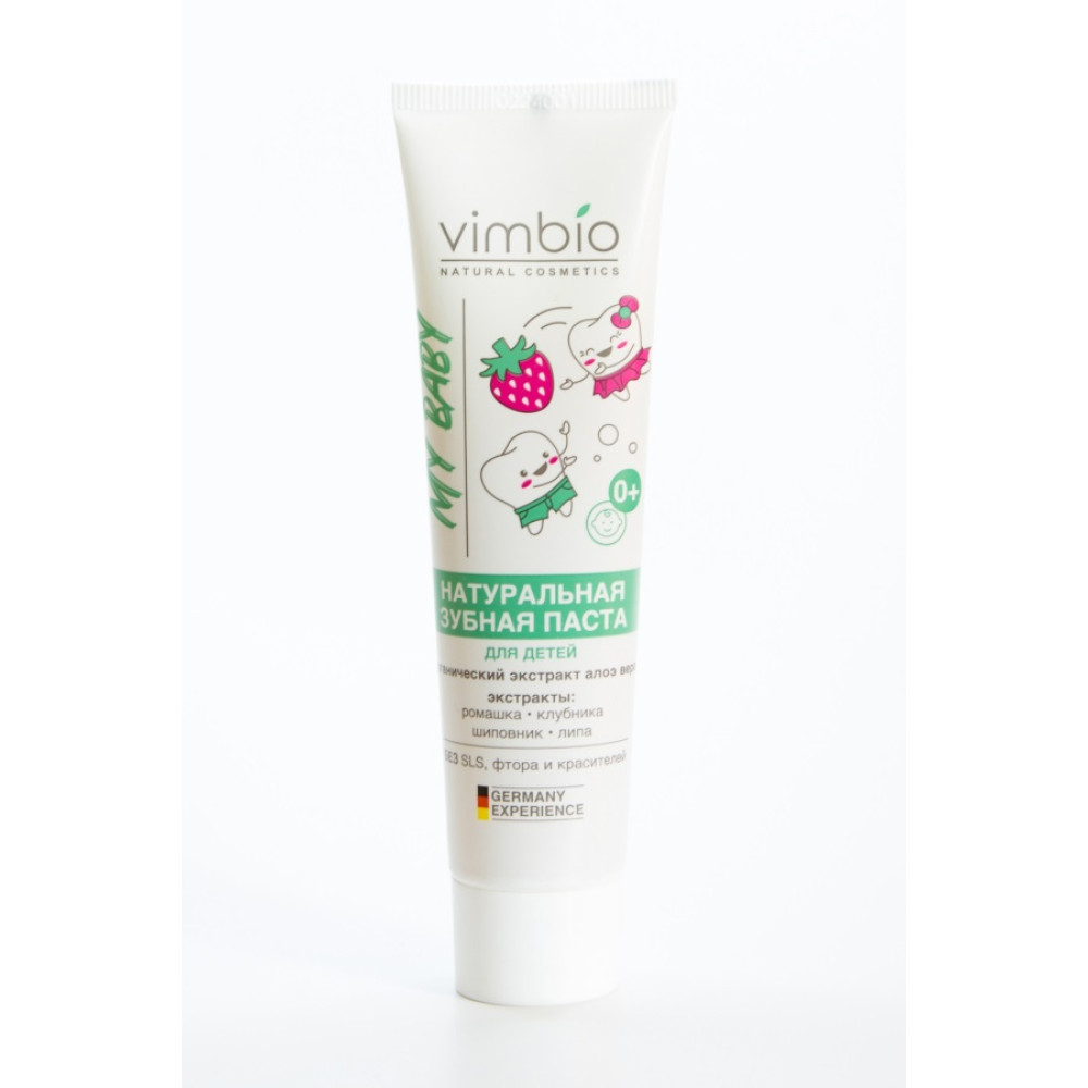 VimBio натуральная детская зубная паста с клубникой, 0+ специально разработана для ежедневного применения с первого зубика. Сбалансированная формула с органическим алоэ вера, экстрактами липы, ромашки, шиповника, бисабололом и папаином обеспечивает бережное очищение, не повреждая зубную эмаль, предотвращает появление зубного налета и развитие кариеса.